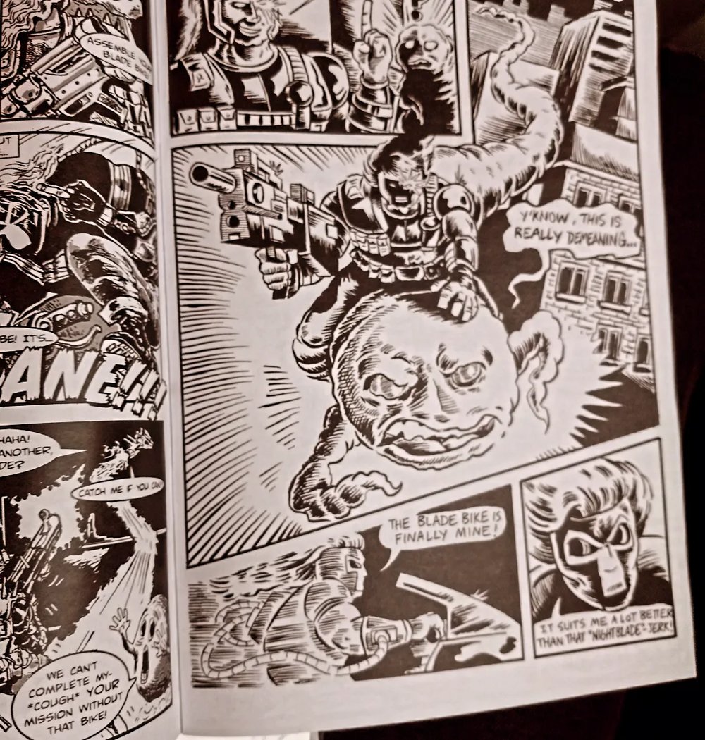 Nightblade is a futuristic mercenary sent back in time to fulfill a super-secret mission he has forgotten. He’s a man out of time running out of time! Will he remember his past and fulfill the mission or get stuck in 199X forever?!?