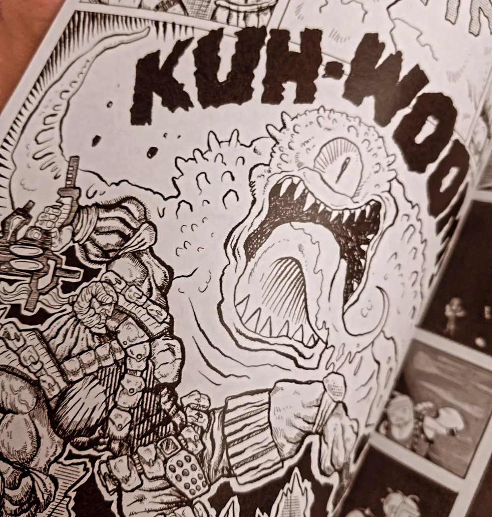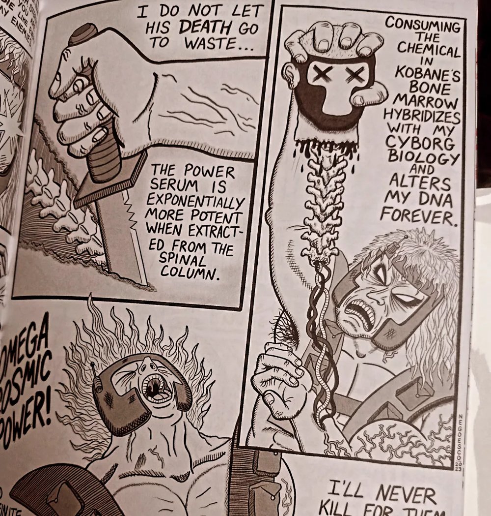 Over 30 of the finest underground cartoonists come together to bring you the most eXtreme eXperimental comiX in this “narrative-corpse” comic anthology roasting 1990’s comic-book-boom excess! Each artist was tasked to continue the story having only seen the previous artist’s page.