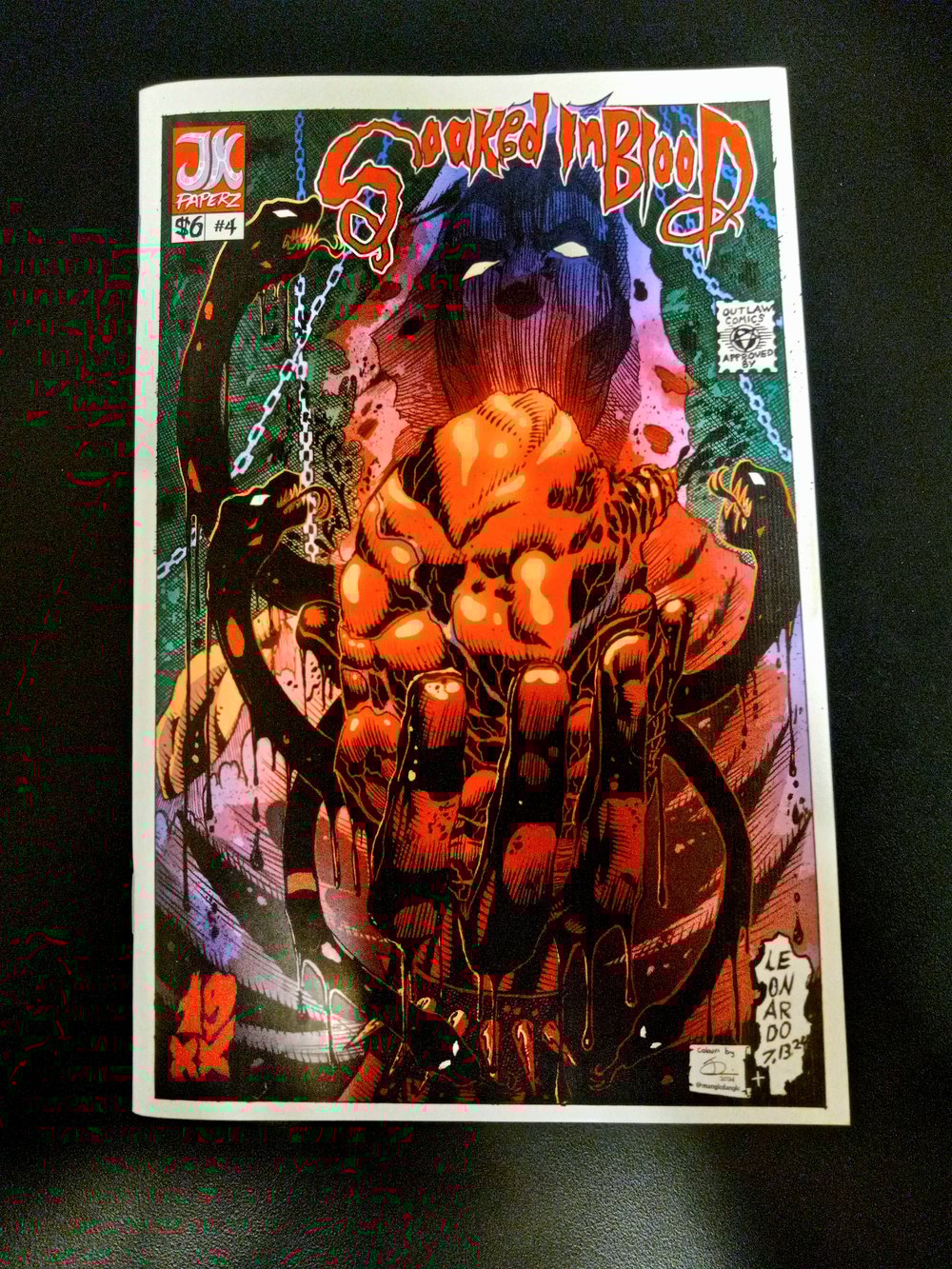 Soaked In Blood 4 is the biggest issue yet and features all the bloody gore and violent funnies you've come to love from the bloody buddies of JK Paperz! Includes an all-new 18-page Max Murder prequel story by guest artist Andrew London, the Return of Charlie B in "Still Killing Punks" by Mike Ford and a ton more goodness and badness from the worldwide crew of artists. Also check out that badass cover by Joseph Leonardo with colors by Jake Quirk! Special cheap pricetag too. Sweet!